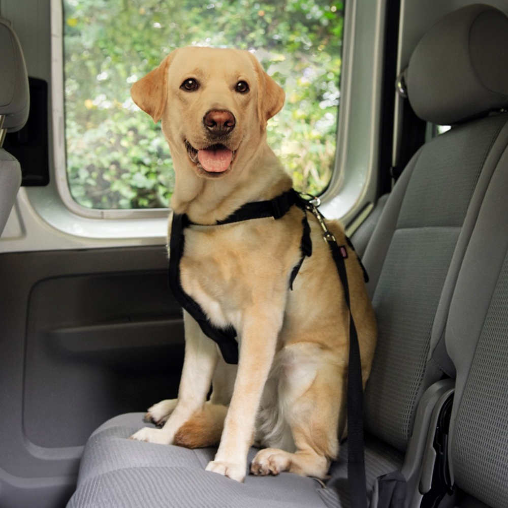Asegúrese que su perro esté atado con la correa al cinturón de seguridad del coche.