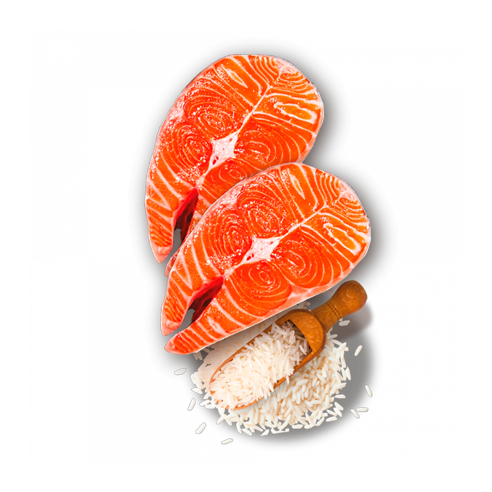 Pollo fresco (55%), hígado de pollo (15%), pollo deshidratado, salmón fresco (mín. 4%)arroz.