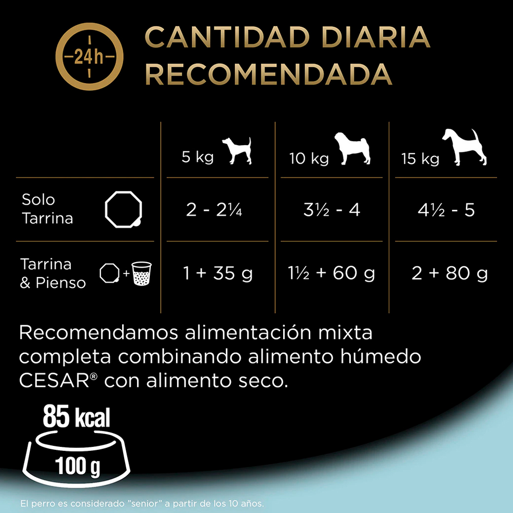 Receta especialmente adaptada a las necesidades de los perros mayores. Elaborada con tiernos trocitos de carne y suplemento de vitaminas y minerales, es el alimento ideal para mantener su vitalidad, y para una fácil digestión.