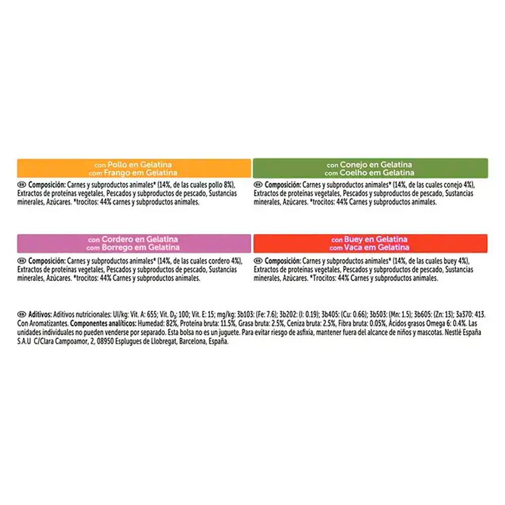 - Variedades que vienen en la caja: Buey, pollo, conejo y cordero.