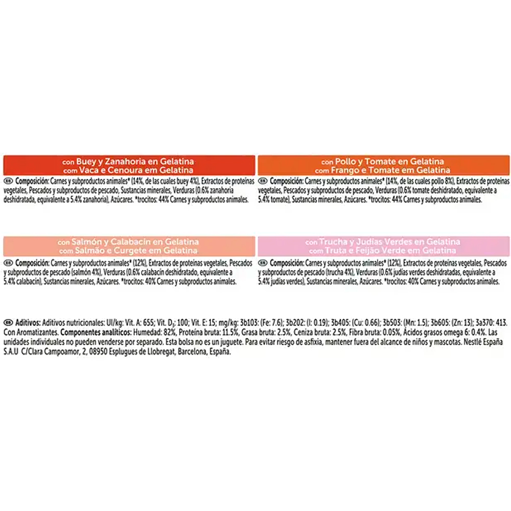 Con Salmรณn y calabacรญn: Carnes y subproductos animales* (12%). Extractos de proteรญnas vegetales. Pescados y subproductos de pescado (salmรณn 4%). Verduras (0,6% calabacรญn deshidratado, equivalente a 5,4% calabacรญn). Sustancias minerales. Azรบcares.