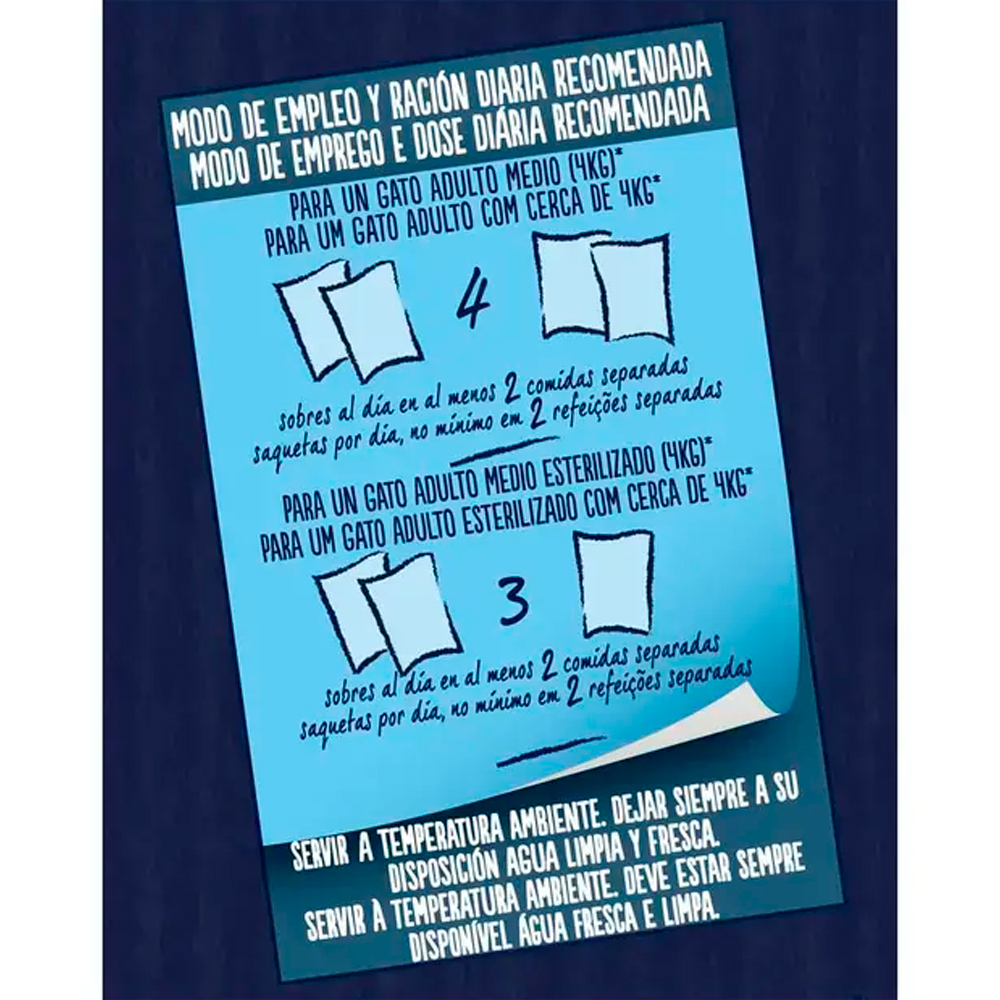 Para un gato adulto medio (4kg) servir de 3 a 4 sobres al dรญa, en al menos 2 comidas separadas.